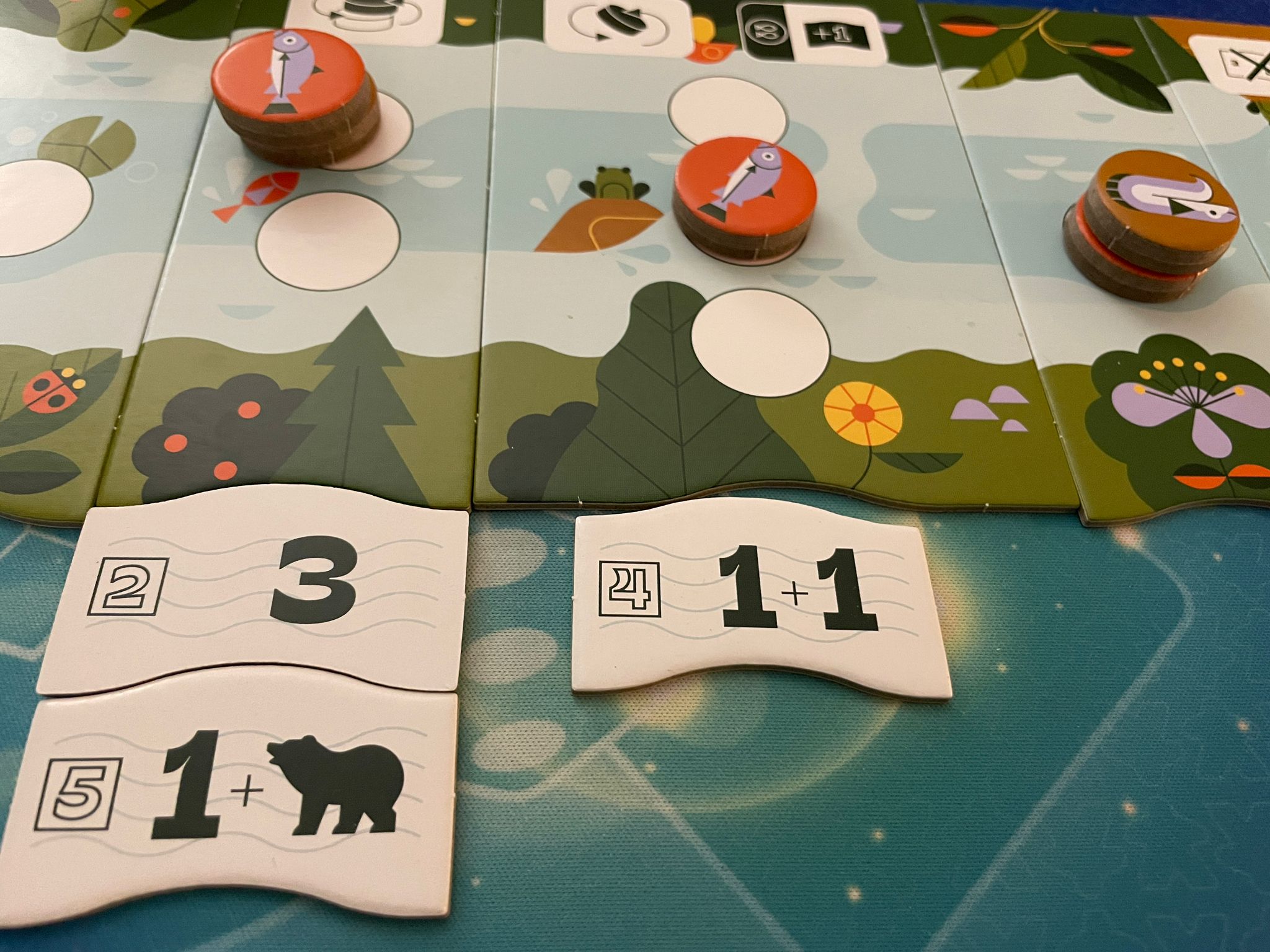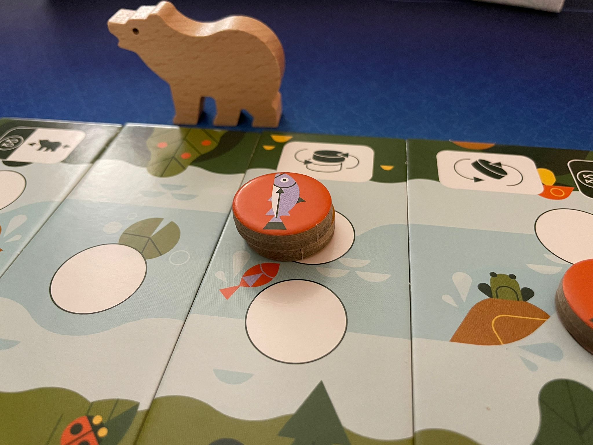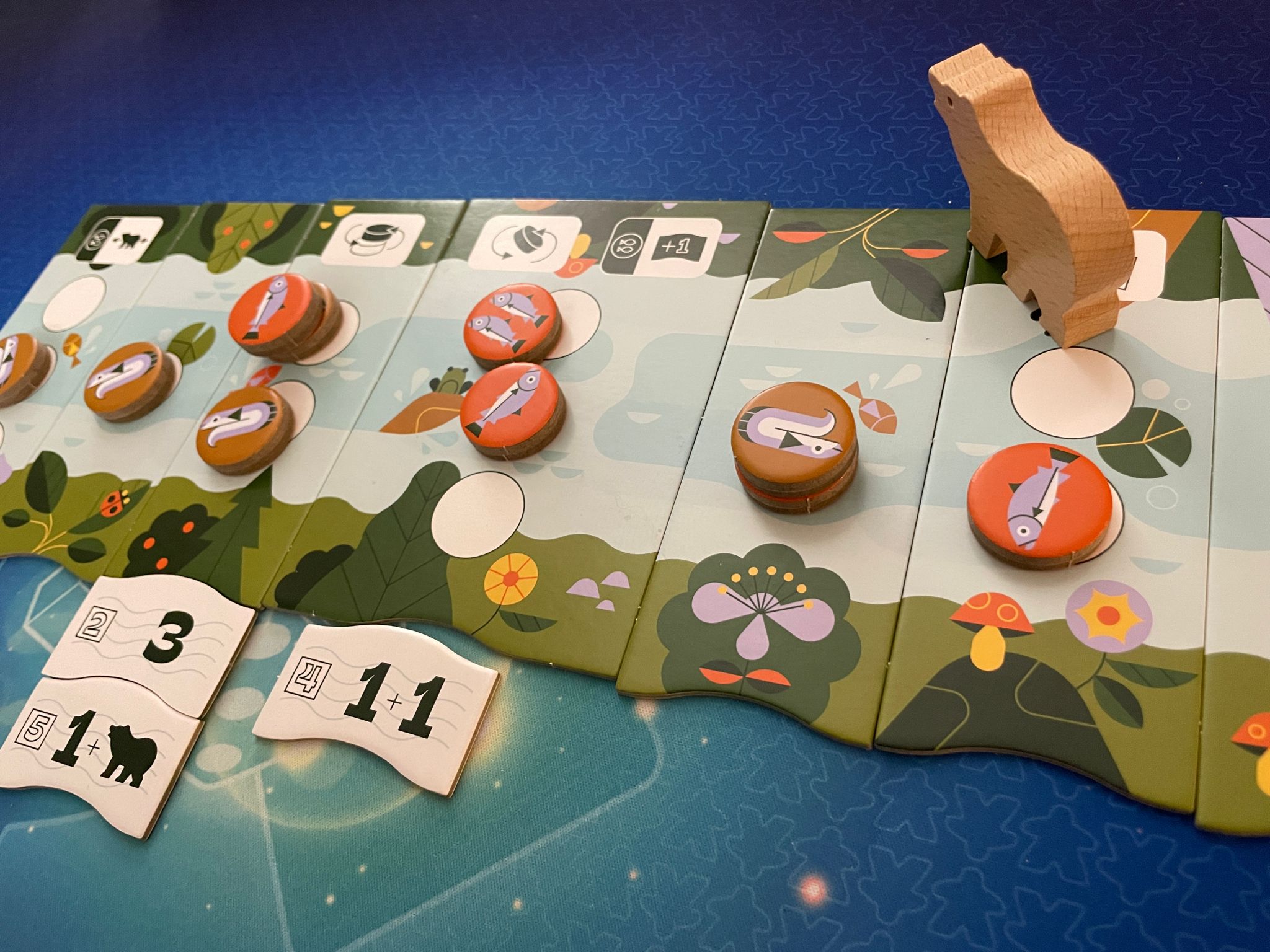 Vous allez incarner des anguilles ou des saumons, et votre but sera d’amener l’ours d’un côté ou de l’autre de la rivière, soit chez les saumons ou chez les anguilles. Pour cela, vous aurez des tuiles qui vous feront avancer, et la rivière qui vous fera faire des actions. Vous pourrez vous mettre sur un adversaire, et il pourra faire une pirouette pour repasser sur vous.