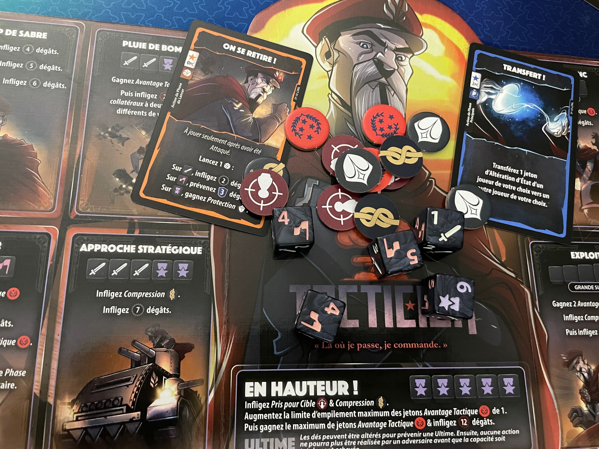 C’est maintenant qu’on va pouvoir améliorer nos actions grâce aux cartes joués, une fois que vous aurez fait tout ça et dépensés vos points de combats vous pourrez passer à la phase suivante, la phase d’attaque, où vous allez jeter les dés et vous allez pouvoir en garder pour les symboles et en relancer d’autres vous pourrez le faire deux fois, puis vous choisissez l’effet que vous voulez faire par rapport à votre combinaison de dés.