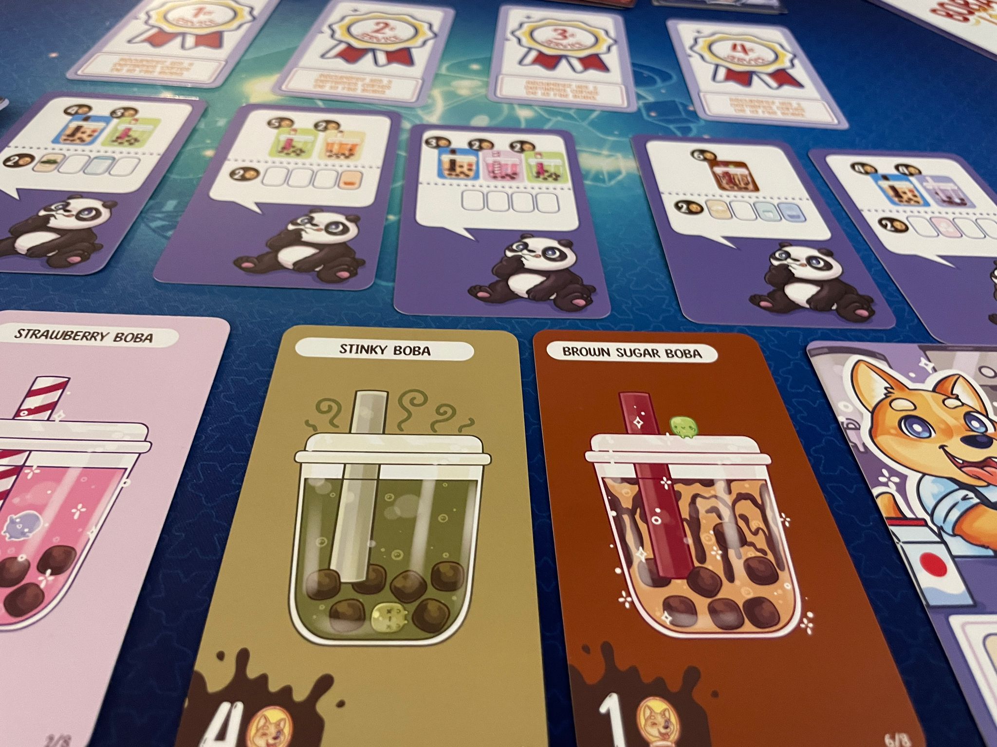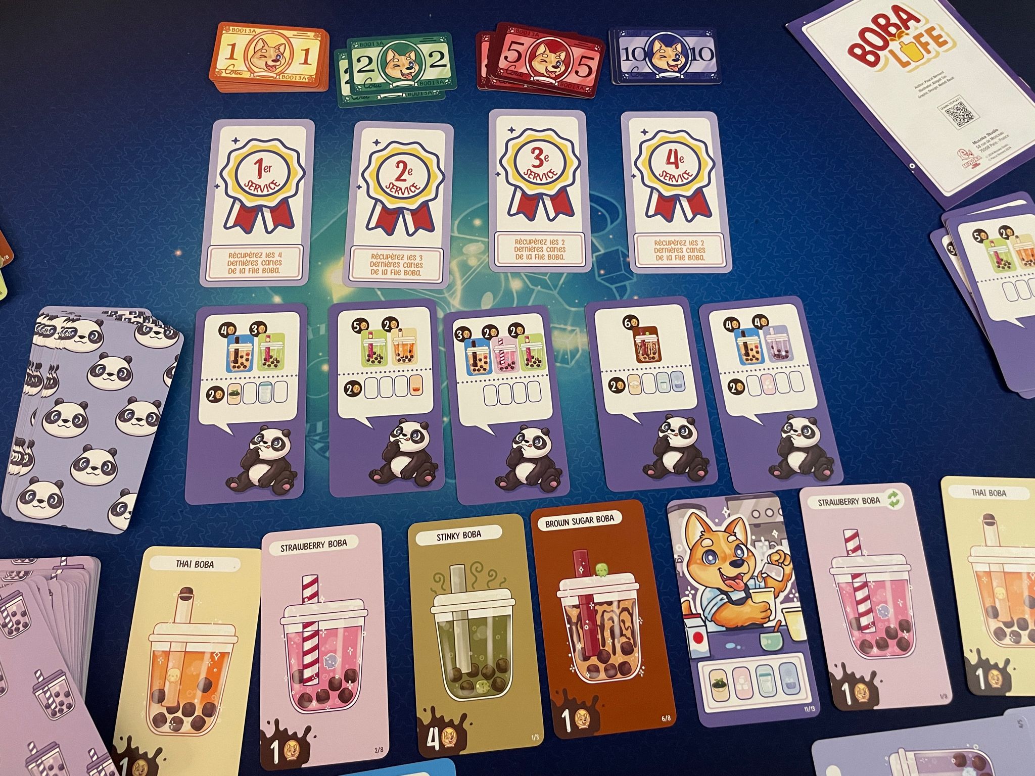Dès que vous prenez des cartes, vous les prendrez toujours par ordre de sortie de la plus récente à la plus ancienne puis vous allez devoir essayer de servir des clients en défaussant les bubble tea demandés ainsi que les cartes de préférences. Vous gagnerez de la moula pour chaque clients servis et vous aurez de la tune en plus pour tout extra mais aussi, vous gagnerez encore plus en servant des lignes de clients (en commençant par le premier).