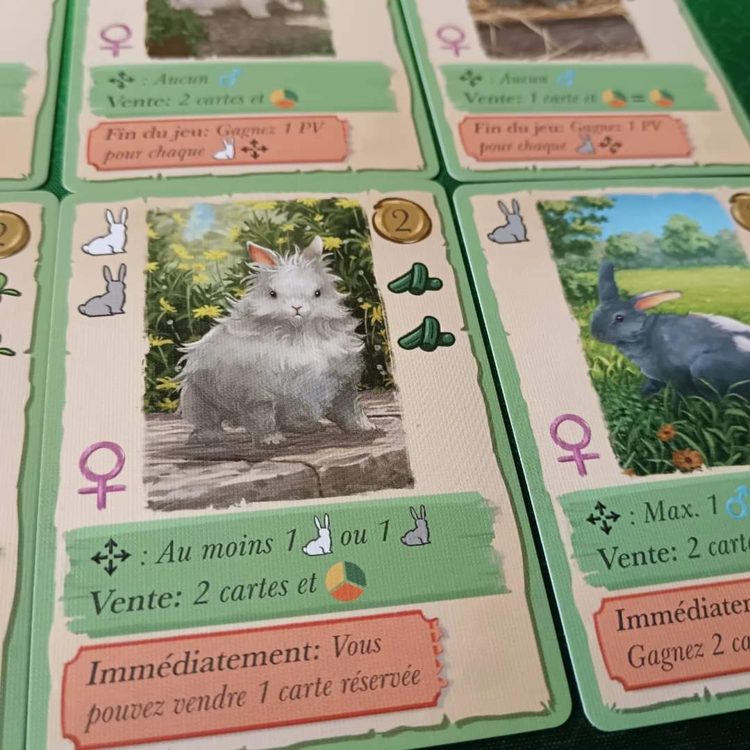 La partie se termine dès qu’un joueur place sa 9e carte, puis on procède au décompte des points. Les cartes lapins rapportent des points de base, mais leur placement est soumis à des contraintes de couleurs ou de sexe par rapport aux cartes adjacentes, et elles offrent des bonus immédiats, durant la partie ou en fin de jeu.