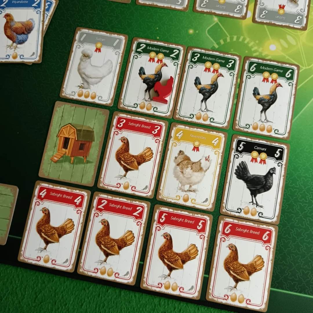 Les règles de pose ? Les cartes doivent être placées de manière adjacente. Si vous placez une poule d’une couleur différente de la carte adjacente, sa valeur doit être inférieure ou supérieure de 1. Si les cartes sont de la même couleur, la valeur n’a pas d’importance, mais attention à ne pas vous bloquer pour les prochains coups ! Votre poulailler sera composé de 12 cartes, disposées en 3×4 ou 4×3.