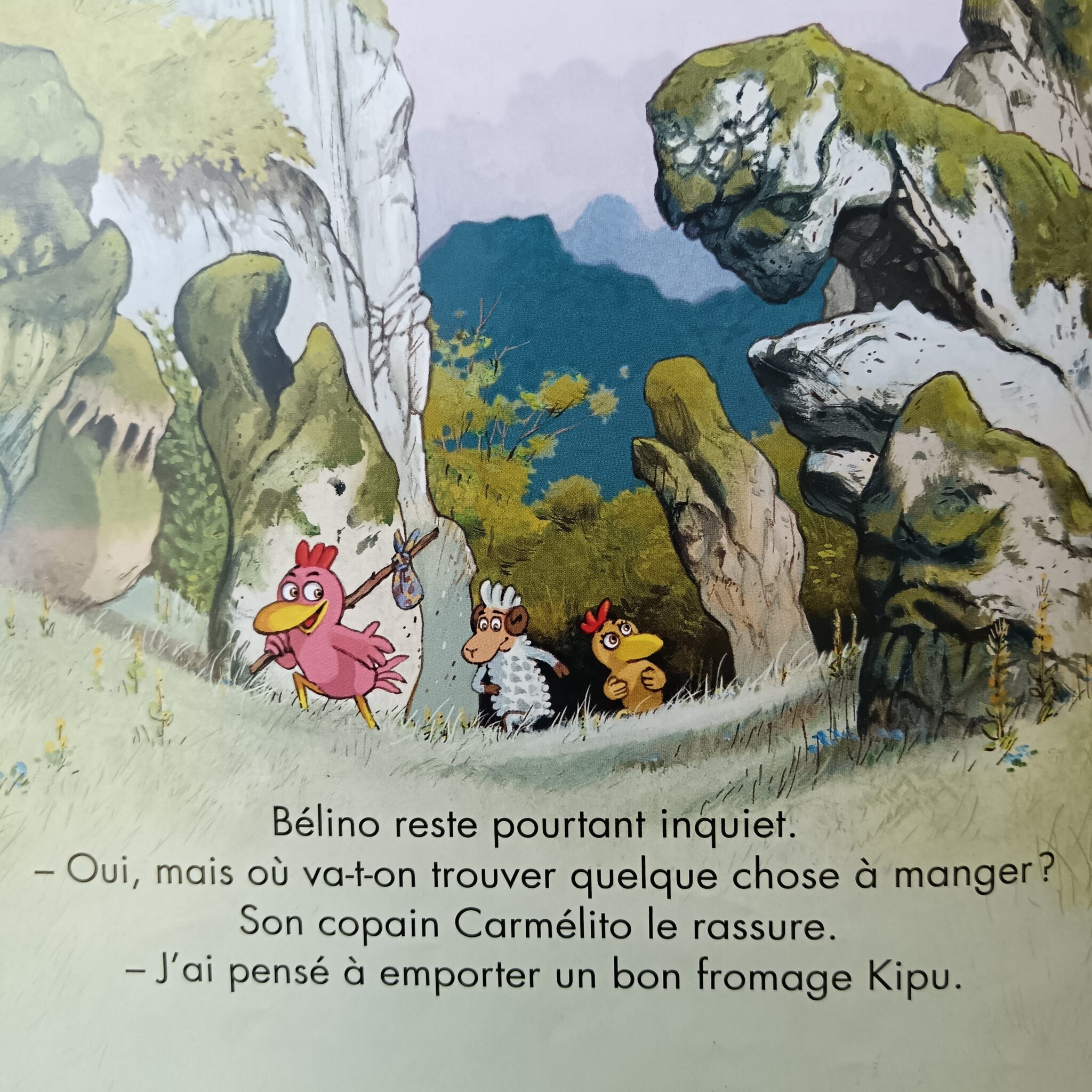 Dans Une poule pour tous, tous poule un, c’est Bélino, le bélier, qui devient le héros. On y retrouve Carmélito, le jeune coq intrépide, et sa sœur Carmen, toujours prête à trouver des solutions ingénieuses pour sauver la situation, ainsi que leur ami fidèle Bélino, un petit bélier qui les suit dans toutes leurs aventures, même s’il est parfois peureux. Au début de l’histoire, Bélino refuse de se faire tondre par les bergers du roi, et Carmélito et Carmen lui dénichent une cachette pour lui éviter la honte d’être vu sans sa laine.