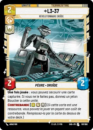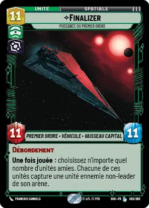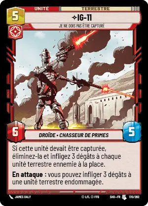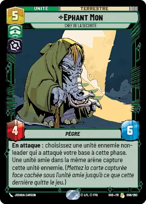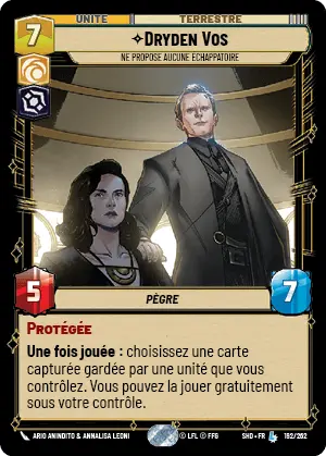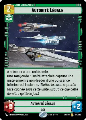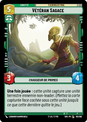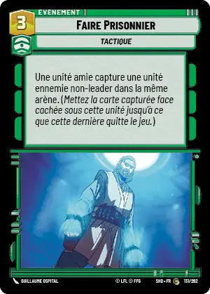 Plusieurs cartes proposent cette nouvelle mécanique dans l’extension Ombre de la Galaxie, toutes possèdent une restriction particulière qu’il faut apprendre à connaître, que ce soit sur le coût de la cible, sa puissance, son arène, sa précédente action ou son état actuel. Cette capacité est une spécialité de l’affinité dédiée aux unités, le Commandement, car elle demande de posséder une unité en jeu pour effectuer la capture.