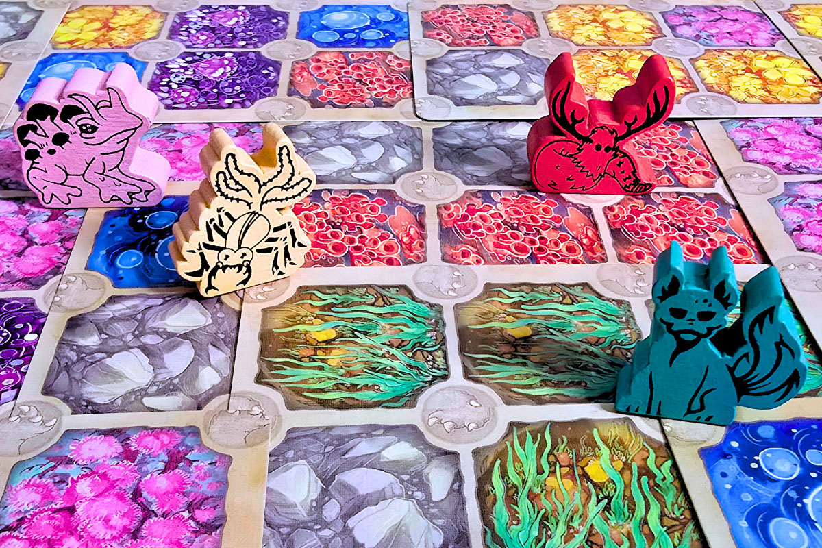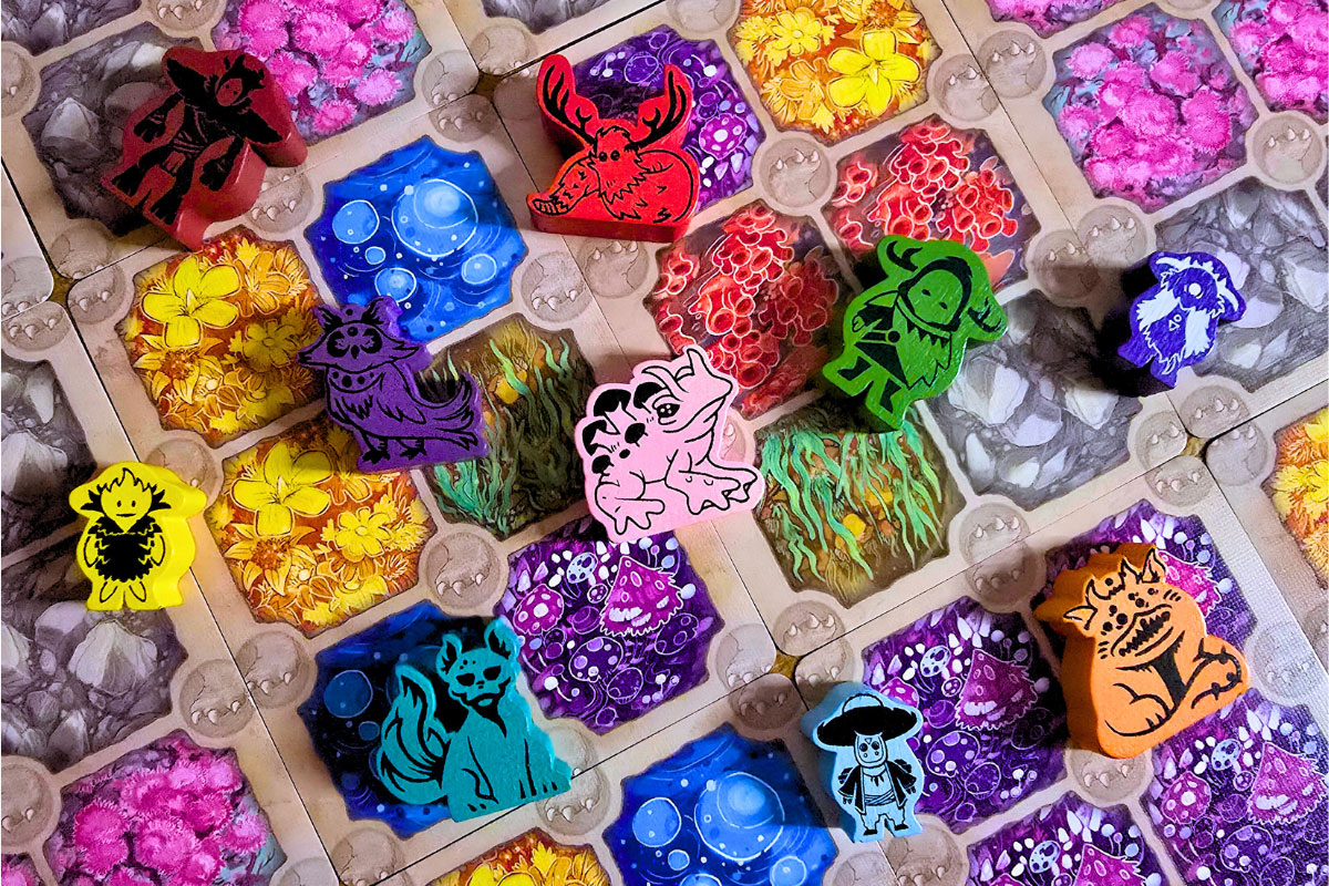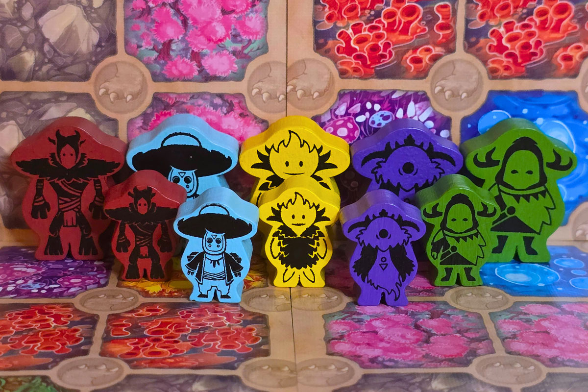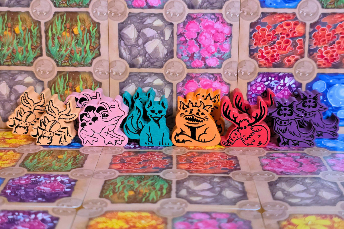 Côté matériel, on peut tout particulièrement s’attarder sur ses jolis meeples, tous plus mignons les uns que les autres (même les “créatures” sont mignonnes, c’est pour dire…), mais aussi sur son plateau chatoyant.
