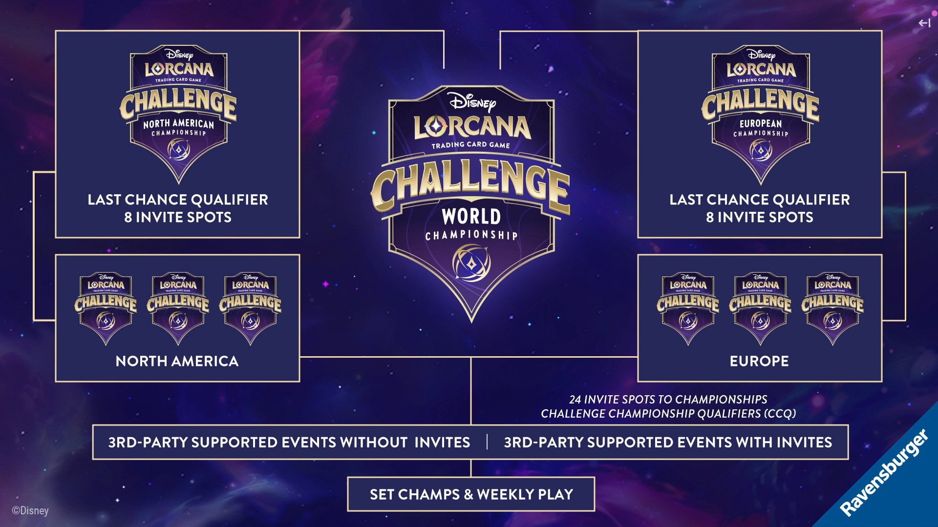 On vient d’avoir une annonce de Ravensburger concernant les prochains championnats de set. On savait déjà que le personnage central serait Daisy Duck pour les championnats du set 10, mais désormais on sait que la carte offerte à tout le monde sera full-art ! Une bonne amélioration pour l’ensemble des joueurs, sachant que le top 8 aura toujours la carte foil et le vainqueur le tapis Champion.